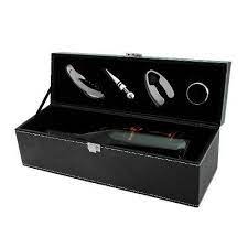 This faux leather box makes an excellent gift. Capable of holding one bottle of wine, the gift box includes four different wine tools: a corkscrew, bottle stopper, foil cutter and drip ring. With a clean and classic look, this box is a great addition when giving the gift of wine.